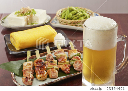 焼き鳥とビールの手描きイラストセット(カラー/輪郭線なし)