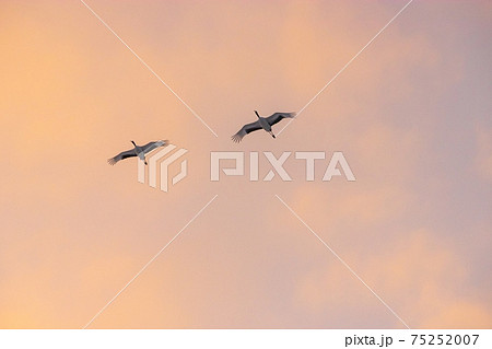 タンチョウが夕焼け空を飛ぶ