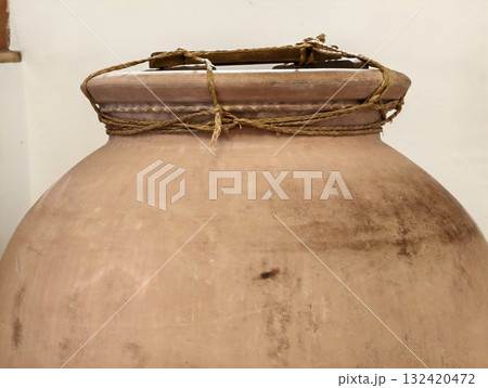 old terracotta jar, aged rustic clay storage vessel with textured surface and charming handle design