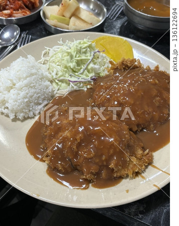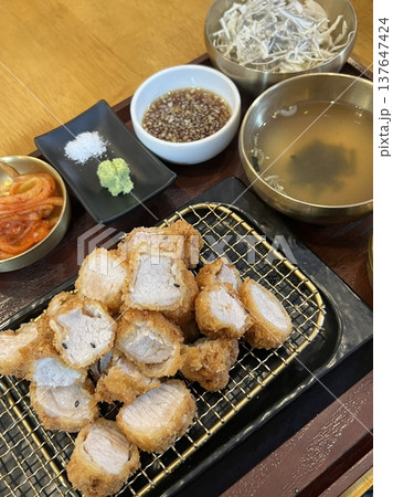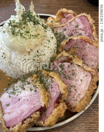 Crispy tonkatsu, a Japanese-style breaded and deep-fried pork cutlet, served with shredded cabbage and drizzled with savory sauce. A delightful balance of crunchy texture and juicy meat.