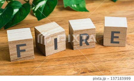 FIREを表す木製ブロック、早期リタイアと経済的自立の資産形成コンセプト