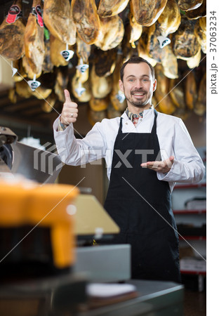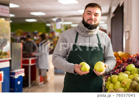 Young cheerful salesman wearing apron standing in supermarket and looking at camera. Professionals. Staff concept.