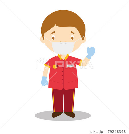 Cute cartoon vector illustration of a clerk or cashier with surgical mask and latex gloves as protection against a health emergency