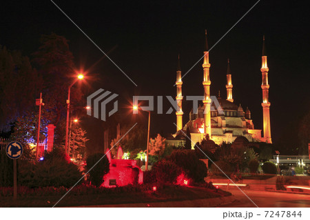 トルコ エディルネの夜の旧市街にあるライトアップされたセリミエ・モスク