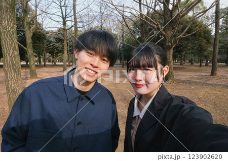公園で自撮りする若いカップル