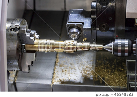 The multi-tasking CNC lathe machine swiss type tapping the brass shaft parts.