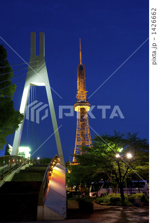 《愛知県》名古屋都市風景 ライトアップされたテレビ塔と久屋大通公園セントラルブリッジ