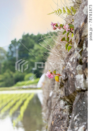 ピンクの棚田の石垣に咲く四季咲き秋海棠