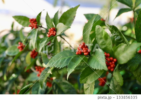 赤く美しい果実をつけるセンリョウカセンリョウ
