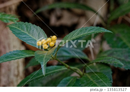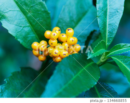 葉上に丸く黄色い果実を成らすキミノセンリョウ