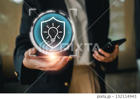 Business professional holding a digital shield with a light bulb, symbolizing intellectual property protection and innovation.