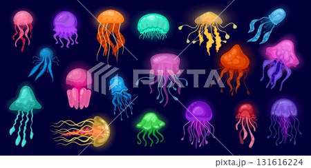 Glowing jellyfish. Cartoon medusa, neon jelly fish sea deep fantasy creature magic exotic underwater animal ocean beautiful marine fauna aquatic life, kicky vector illustration
