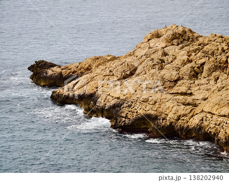 Coastal erosion scene, Weathered cliffs with crashing waves, Seaside rocky wall battered by surf and spray