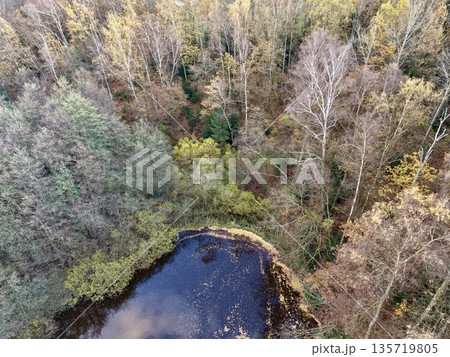 quiet natural pond amidst trees and reeds, serene woodland pond surrounded by moss and wildlife activity