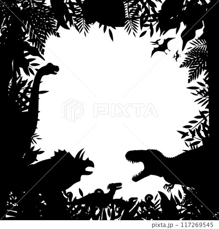 ティラノサウルスとトリケラトプス 太古の植物と白亜紀の陸恐竜のシルエットフレーム(背景)