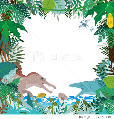 スピノサウルスとモササウルス 太古の植物と白亜紀の海の恐竜のフレーム(背景)