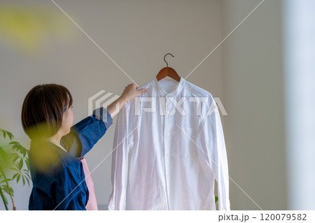 タオルで掃除道具を拭く日本人女性清掃員の温かい姿