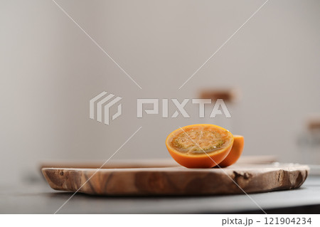 Lulo fruit sliced in halves on olive wood board on kitchen countertop