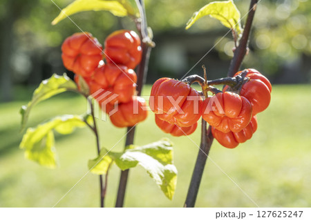 秋の日差しを浴びたパンプキンツリー 観賞用ナス科のソラナムパンプキン