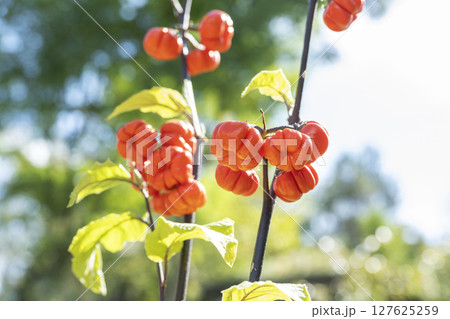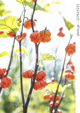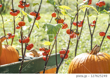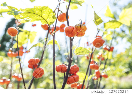 秋の日差しを浴びたパンプキンツリー 観賞用ナス科のソラナムパンプキン