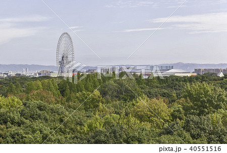 万博記念公園から臨むオオサカホイール、エキスポシティ、吹田スタジアムの秋の眺望