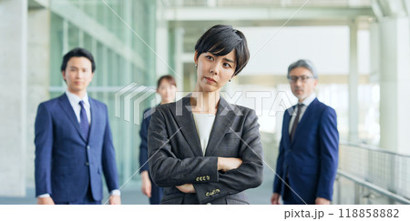 デスクで窓の外を眺めて楽しいことを考えている女性