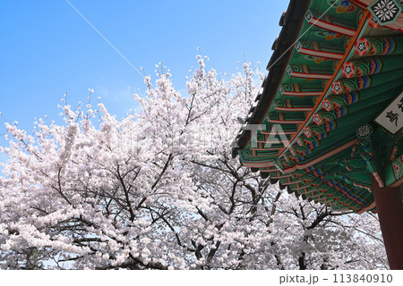 韓国 伝統模様の屋根と桜