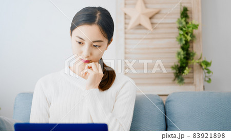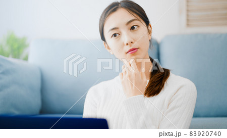 パソコン作業の合間に方肘をつきながら考え事をする女性