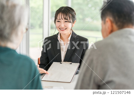 シニア夫婦に書類の説明をする若いアジア人ビジネスウーマン