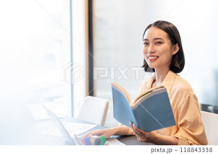 本を片手にパソコン作業しながら笑顔を見せる女性