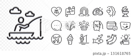 Calendar, Rainbow and Discounts app line icons for web app. Glare of light effect. Message icon. Pack of Boat fishing, Airplane mode, Grilled sausage pictogram icons. Vector