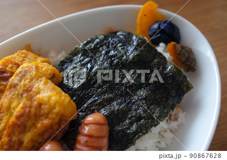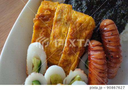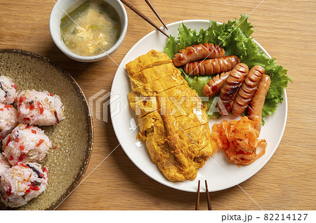 カリカリ梅のおにぎり、ソーセージ、玉子焼きの食卓