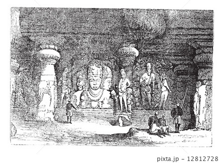 Elephanta Cave in Maharashtra, India, vintage engraving