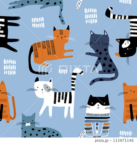 Seamless pattern with cute Kittens in diferent style. Creative childish texture. Great for fabric, textile Vector Illustration