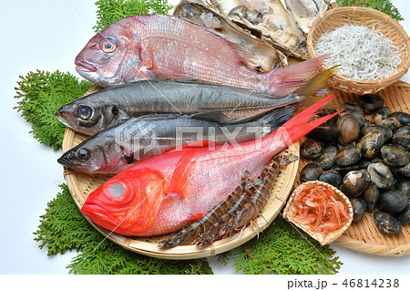 注意)背景に小ゴミ小傷あります。魚介類(金目鯛、真鯛、鯵、牡蛎、アサリ、車海老、シラス、サクラエビ)