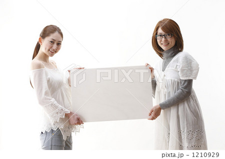 白いメッセージボードを持った笑顔の女性
