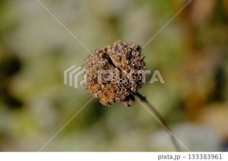 Monarda seeds grow in garden in autumn. Dry Bergamot grows in autumn. Aromatic, medicinal, honey-bearing and ornamental plant growing outdoors. Cottage garden. Sunny day.