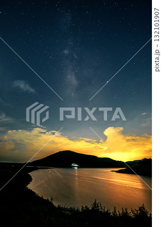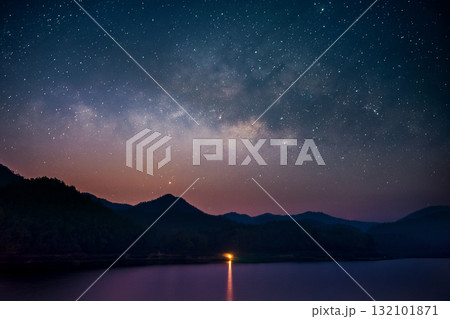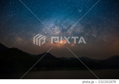 Beautiful landscape mountains and lake in the night with Milky Way background, Chiang mai , Thailand