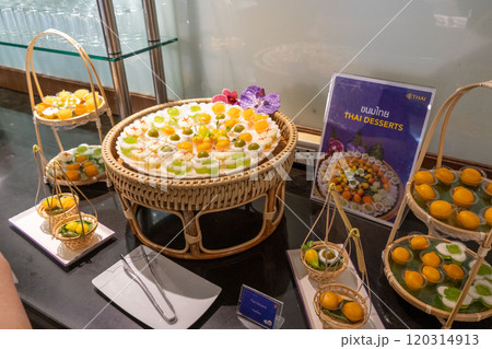 カラフルなタイデザートが並ぶラウンジの一画