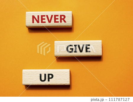 Never give up symbol. Concept words Never give up on wooden blocks. Beautiful orange green background. Business and Never give up concept. Copy space.