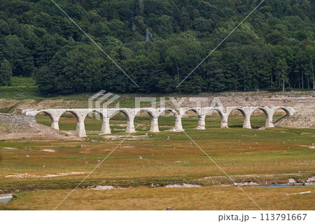 北海道/ 幻の橋といわれるコンクリートアーチ橋 夏のタウシュベツ橋梁(タウシュベツ川橋)と長い影