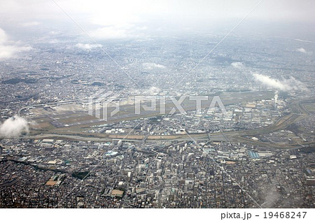 千葉県房総半島の陸上自衛隊木更津駐屯地飛行場と木更津市街地を東京湾上空から望む