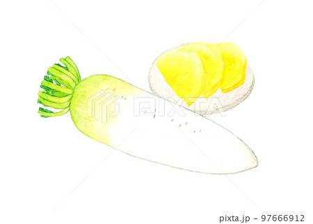 大根とたくあんのセット 野菜と漬物の手描き水彩イラスト素材