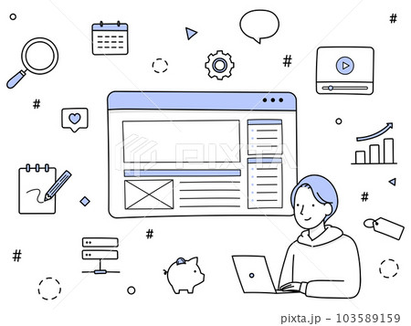 手描きラインアート|ブログの広告収入で稼ぐ若い男性ブロガー