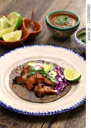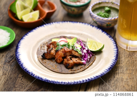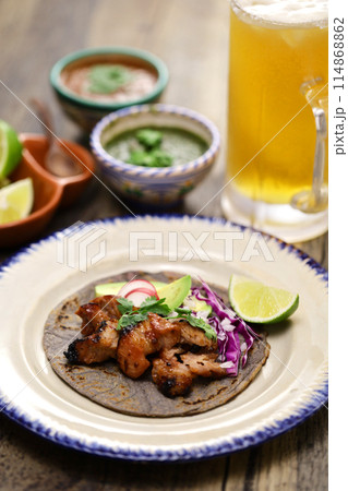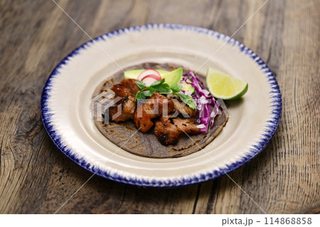 自家製ブルーコーントルティーヤで作る「タコス・アル・パストール」。メキシコ料理