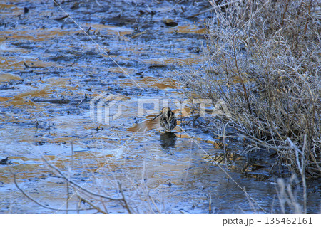 雪の積もった真冬の山の渓流で見られる忍者のような渡り鳥、アオシギ