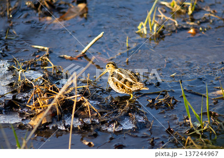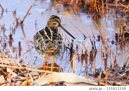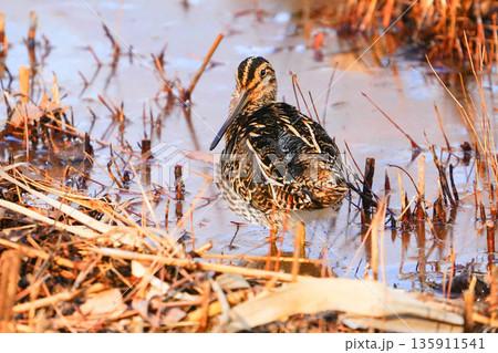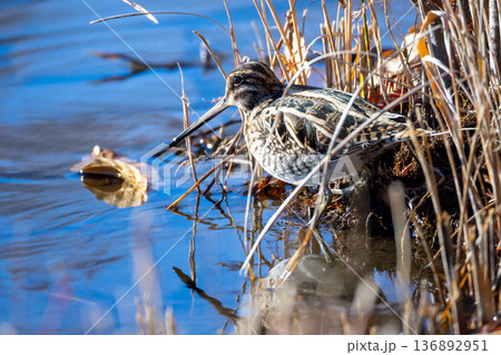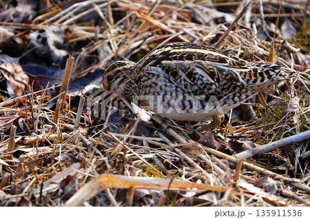 晩秋の蓮田にいる、ジシギの仲間で長い嘴のタシギ