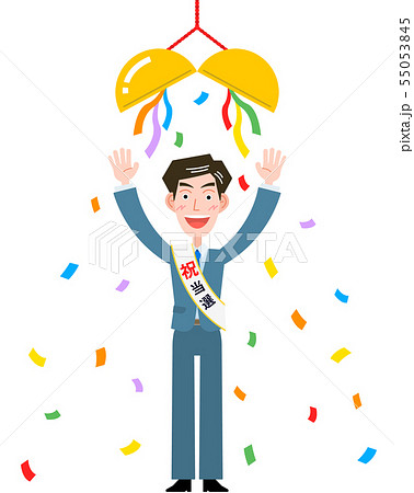 割れたくす玉とタスキをかけたスーツ男性