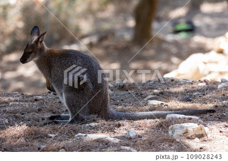 Kangaroo wallaby de Bennett, is sitting on fallen conifers in shade of tree