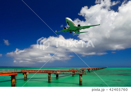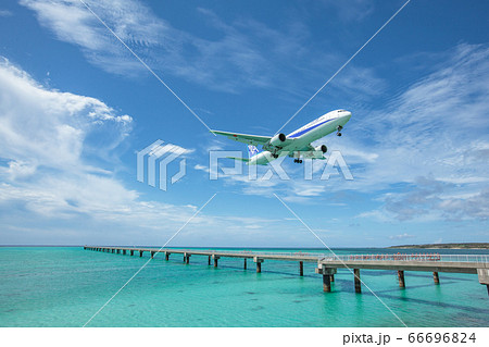 南海離島のエメラルドグリーンの海岸から着陸する飛行機